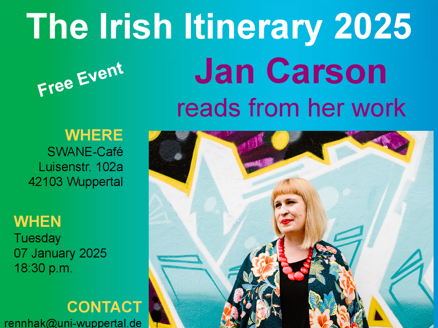 As part of the Irish Itinerary 2025, Northern Irish writer Jan Carson will visit Wuppertal and read from her work at the SWANE Café. Since her second novel, The Fire Starters (2019), won the EU Prize for Literature, Jan Carson has established herself as one of Northern Ireland’s most remarkable and influential writers. Her work includes two further novels (Malcolm Orange Disappears, 2014, and The Raptures, 2022), two short story collections (Children’s Children, 2016, and Quickly, While They Still Have Horses, 2024), and two flash fiction anthologies (Postcard Stories 1 & 2, 2017 and 2020). Carson’s fiction blends the magical and the mundane to explore the past, present and future of the Protestant community in Northern Ireland. In the process she raises highly relevant, general questions about the power of narrative(s) to soothe and disturb, to imagine and reimagine personal and national identities, and to build or destroy communities.